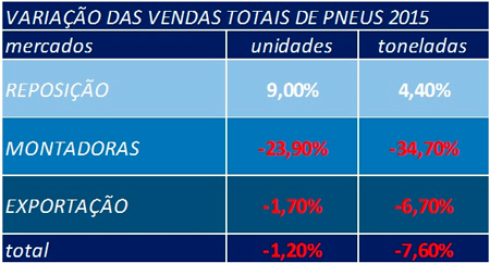 O setor apresentou queda de -1,2% nas vendas ao longo do ano em unidades de pneus. Mesmo com a alta de 9% nas vendas para o mercado de reposição, a forte redução nas vendas de pneus para as montadoras (-23,9%) e para o mercado externo (-1,7%) puxou o setor para o vermelho em 2015.
